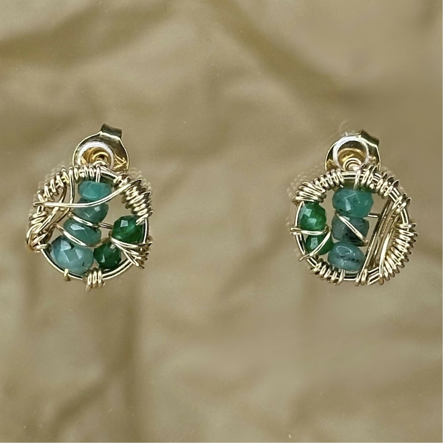 These handcrafted 10mm stud earrings combine the richness of emerald and the soothing green of jade, wrapped delicately in gold-filled wire. Each bead is carefully set to highlight its natural beauty, creating a unique and timeless piece. Elegant and earthy, they bring a subtle pop of color and artisanal charm to your everyday style.