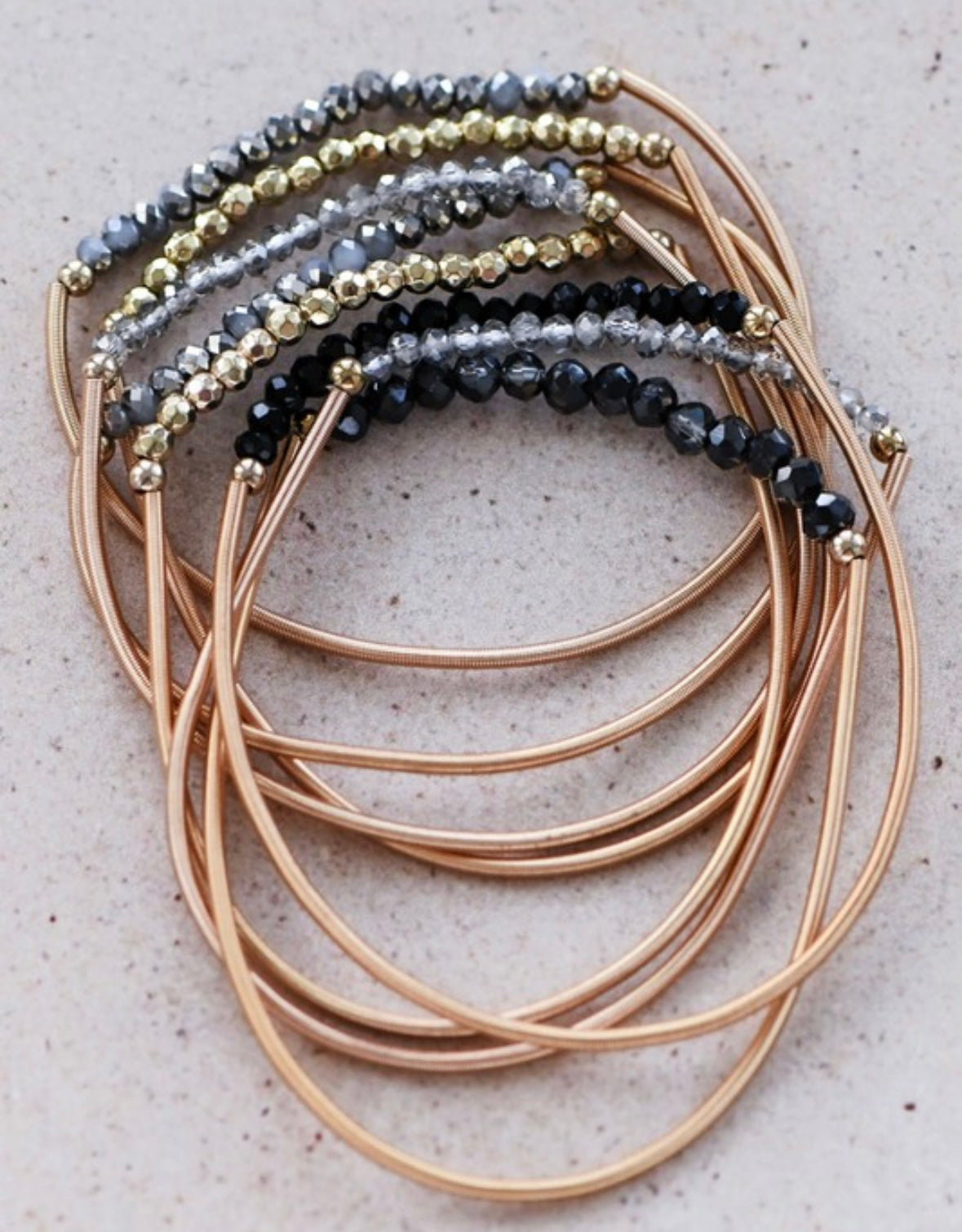 8pc set - guitar string stackable stretch bracelets with glass crystal rondelle beads.